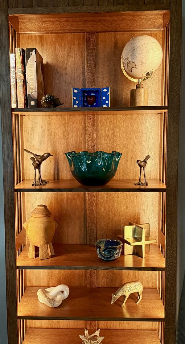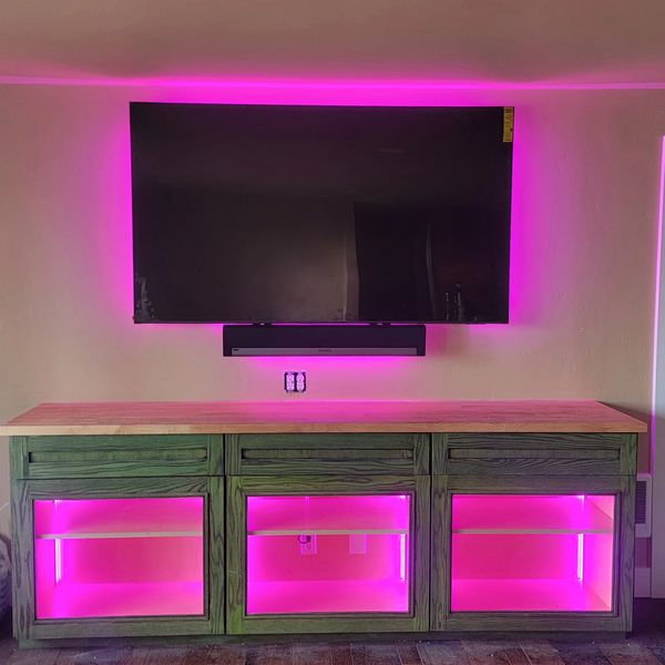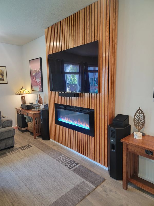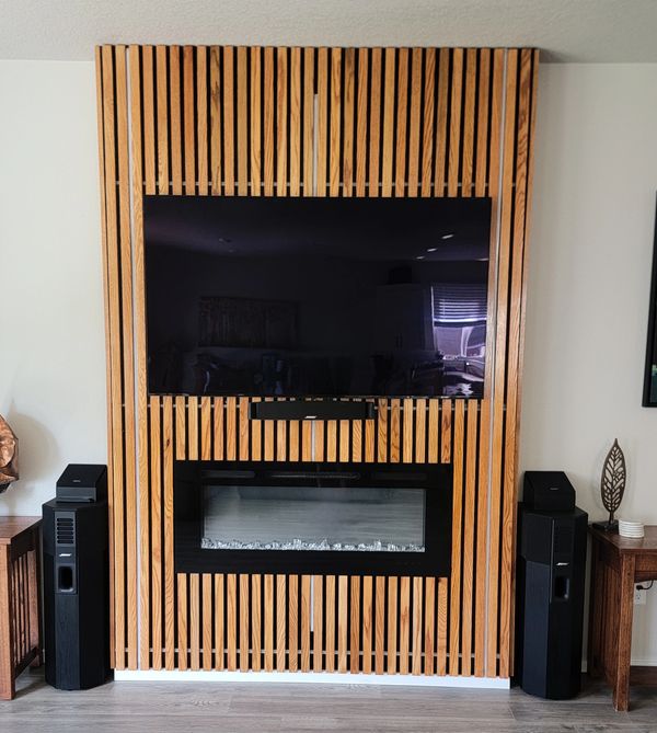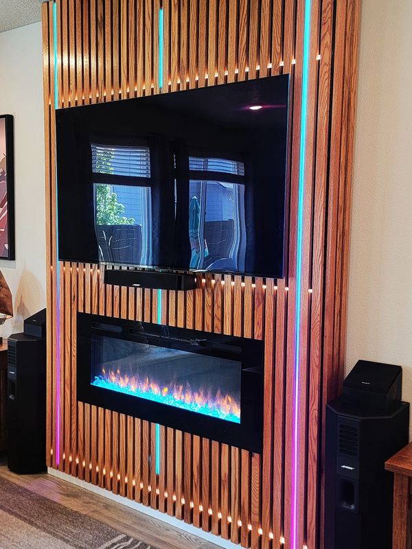 Red oak acoustic panel feature wall integrated with independent controlled LED.